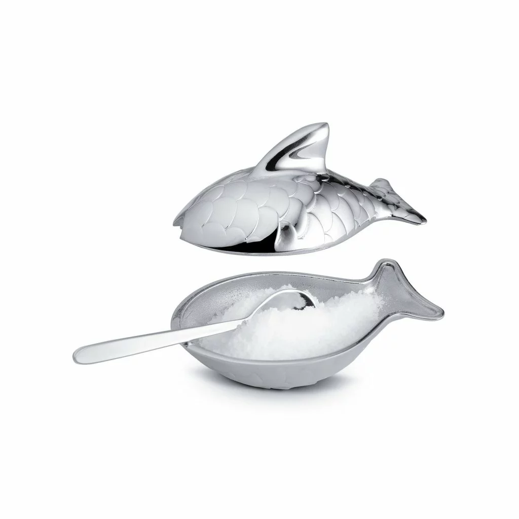 Dekorativt saltkar med tillhörande sked. Colombina Fish tar havet till bordet. Saltkaret är en liten fisk i rostfritt stål.