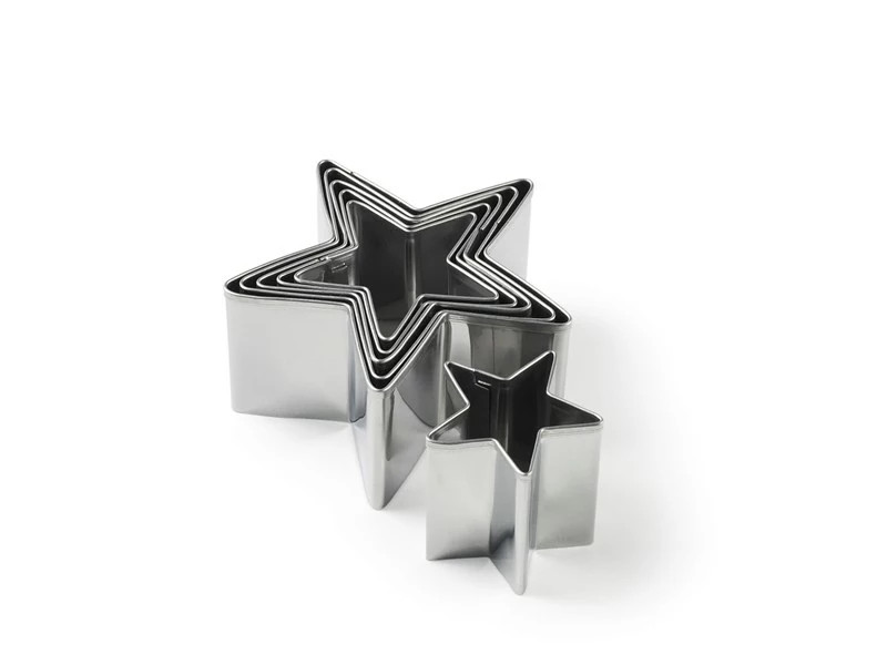 Utstickarset stjärna, slätt. 7 delar. Används bland annat för att forma småkakor, bakelsebottnar, marsipanskivor och olika degar.