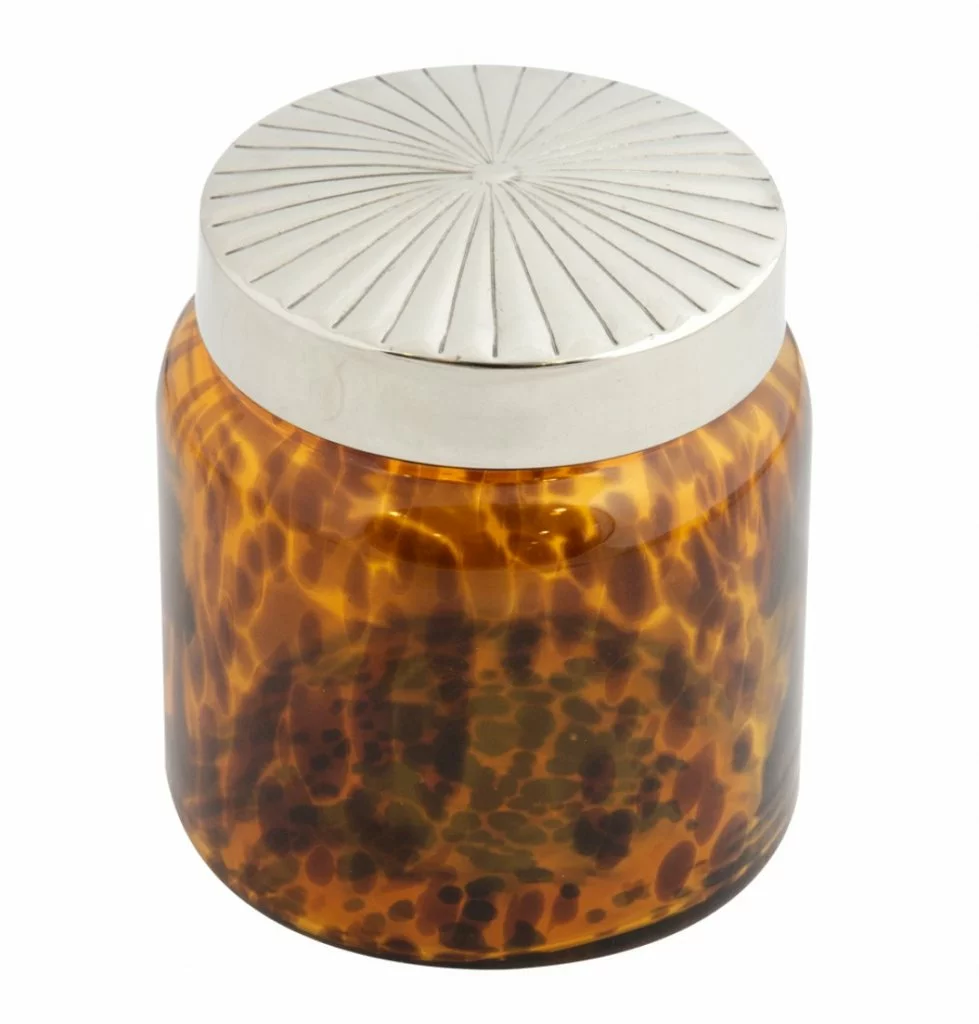 Burk Ariel i glas med lock i metall. H 12,5 B 11 cm.
