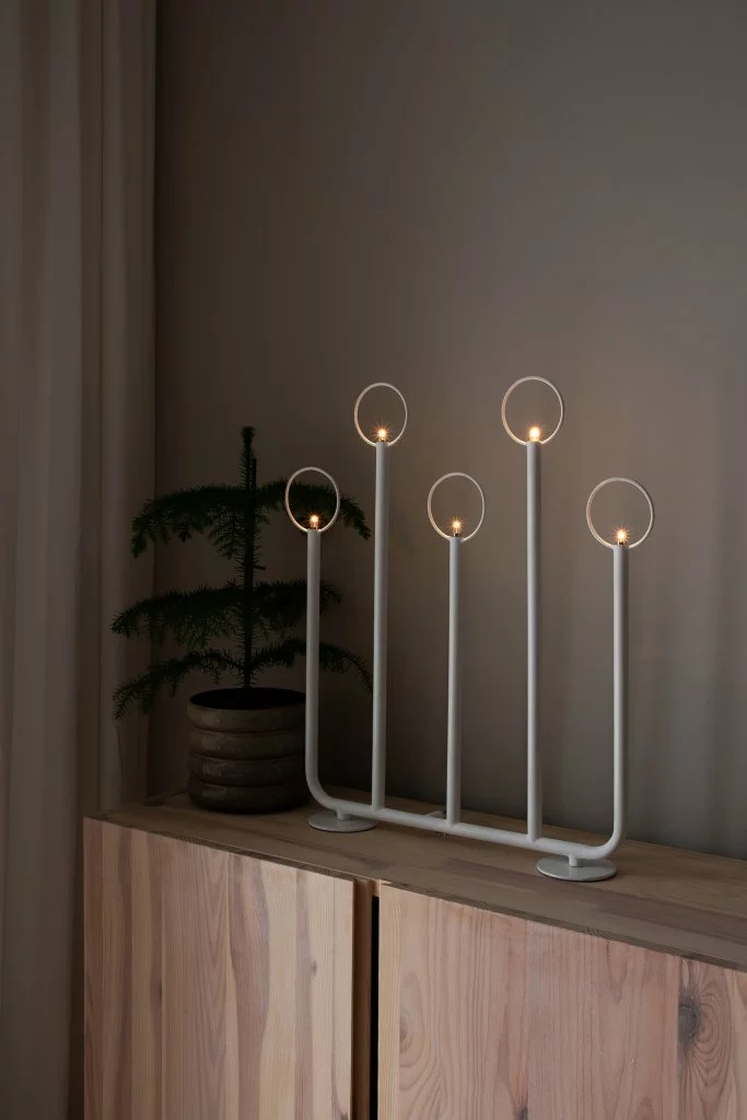 Doften av saffran, kanel och granris börjar närma sig. Du ser fram emot den stämningsfulla tiden i slutet av året och plockar fram lådan från vinden med adventsljusstaken Natale. Lampan som med sina glorior i olika nivåer och nätta ljuskällor sprider ett stämningsfullt och stjärnliknande ljus. Lampans höjd gör att den blir fin både i fönstret och på sidobordet, den är dessutom lika fin från båda håll. Lampan är gjord av vit pulverlackerad metall och levereras komplett med ljuskällor, en 200 cm lång svart kabel med svart brytare, transformator och stickkontakt. Denna klassiska och stilrena adventsljusstake är en detalj som du plockar fram år efter år, när dofterna av saffran, kanel och granris närmar sig återigen.