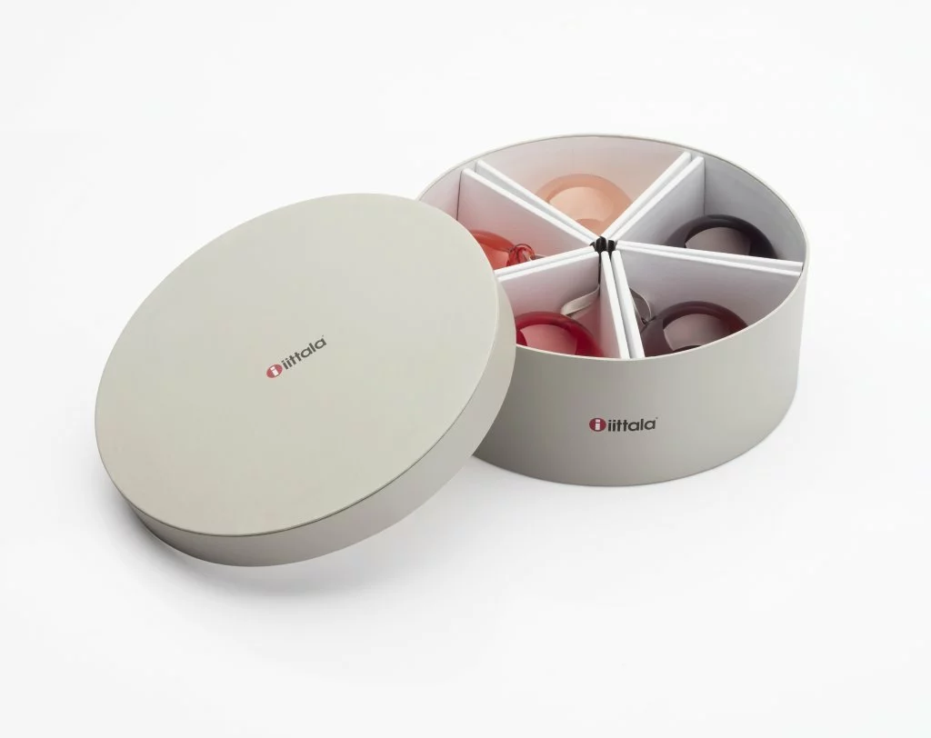 Skapa nya jultraditioner med Iittalas glaskulor i set om 5 olika färger. Varje glaskula är munblåst och har gråa textilband för att hänga i julgranen. Den nya specialutgåvan innehåller en färgstark blandning av grå, gröna och röda kulor. Varje glasprydnad reflekterar sitt eget unika varma ljus och skapar en vacker och harmonisk julkänsla. Den eleganta, runda presentförpackningen gör setet med dekorationskulor till en mycket uppskattad gåva.