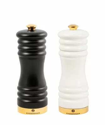 München är en av Zassenhaus mest exklusiva serier. Kvarnarna är tillverkade i vit- och svartlackerad bok och har en dekorativ stålring i nederkant. Knoppen är helt slät. Du bestämmer själv vilken kvarn som är till salt och vilken som är till peppar.